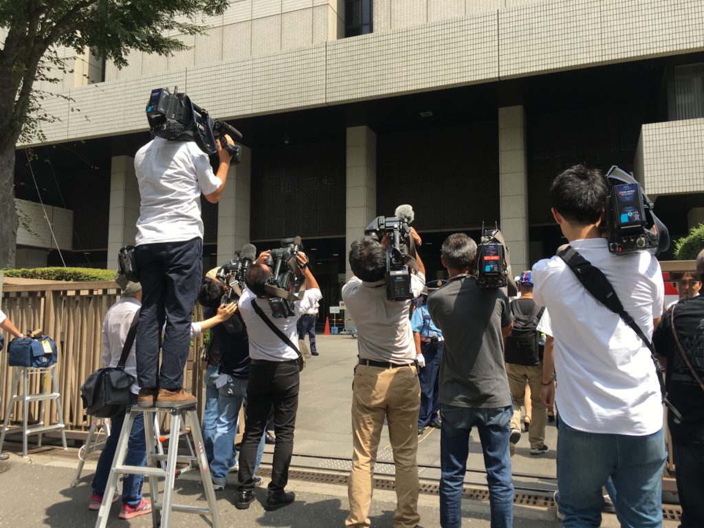 弁護団と支援者の皆さんが裁判所の門を入っていった後,報道陣が横並びになり,一斉に上を向いて裁判所の建物を撮っていました。ニュースでお約束のカットなんですね,きっと。